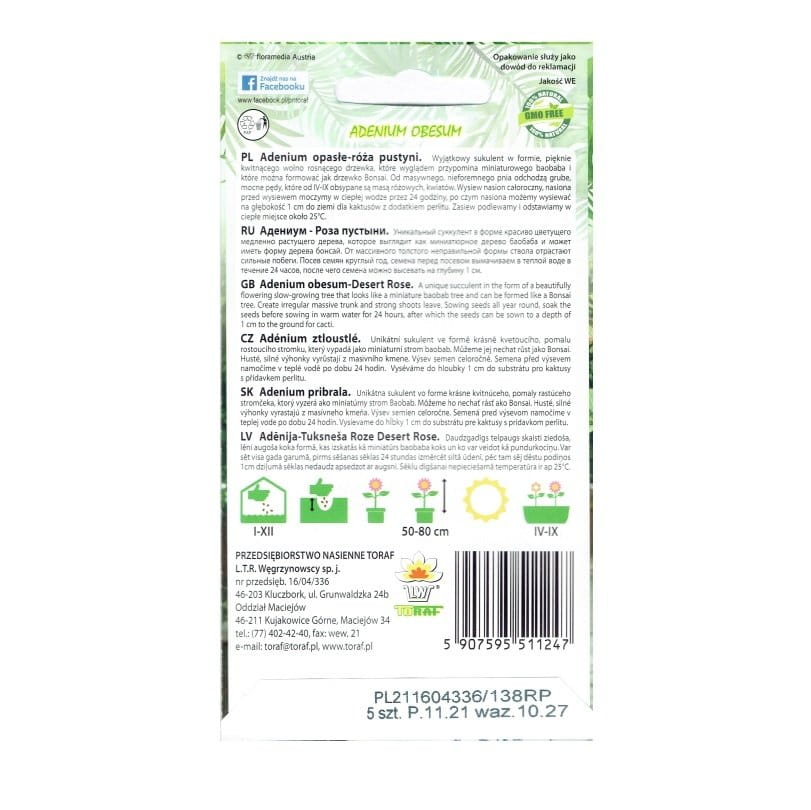 Adenium opasłe - róża pustyni, sukulent na bonsai - 5 nasion marki Toraf