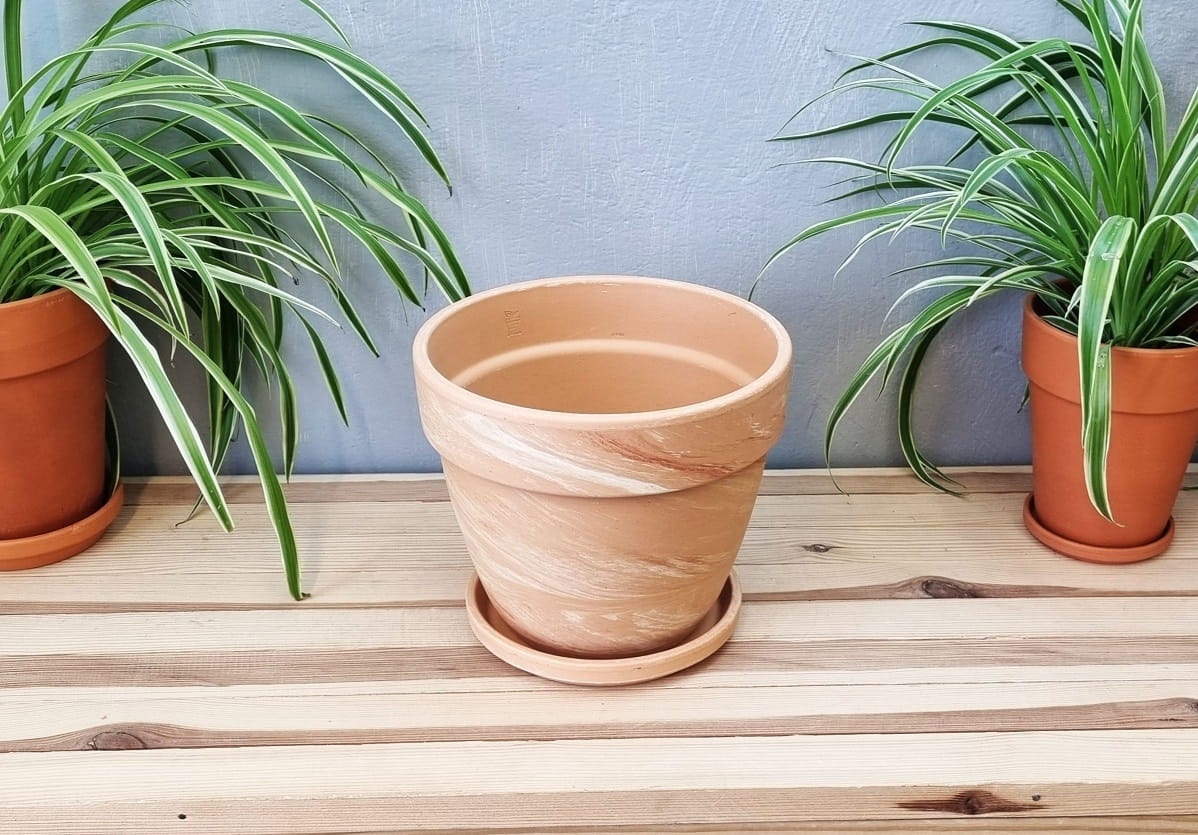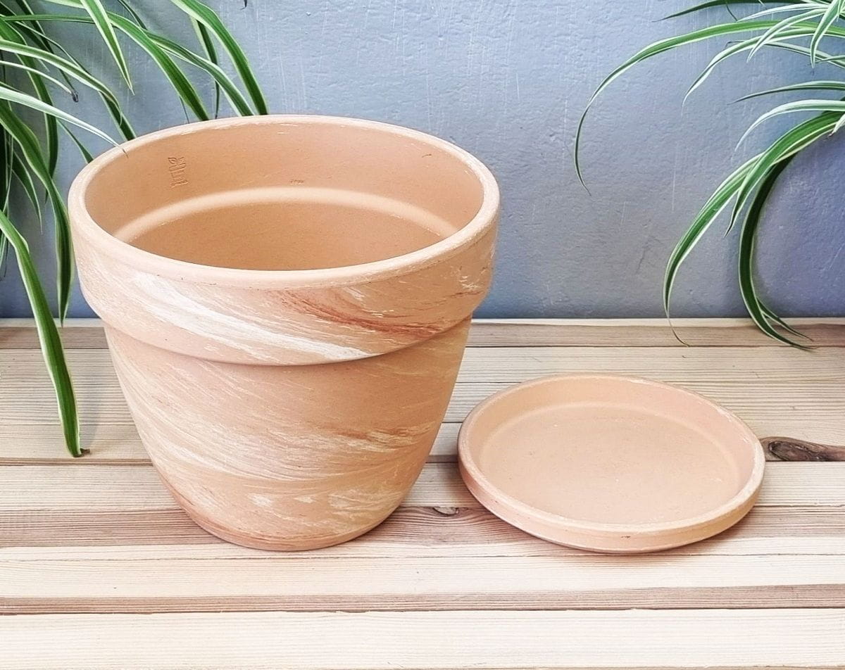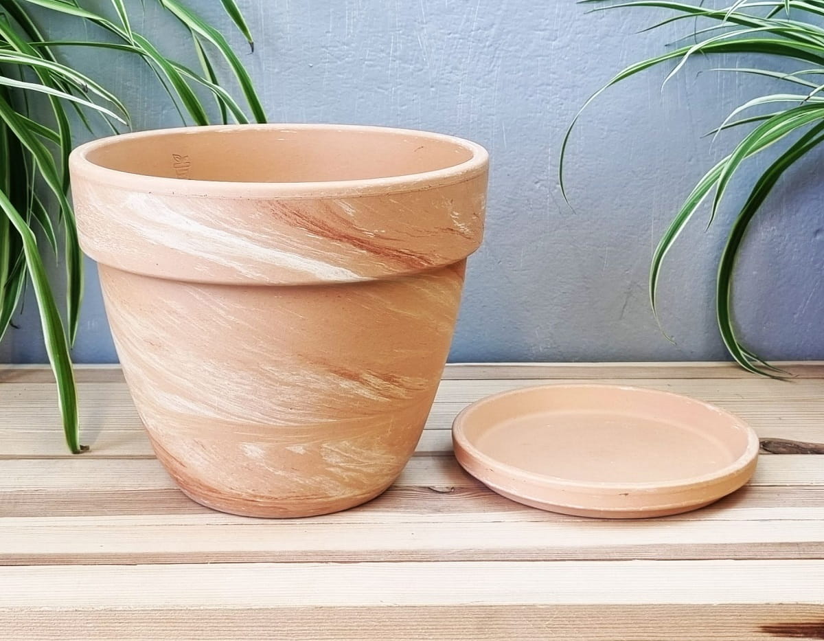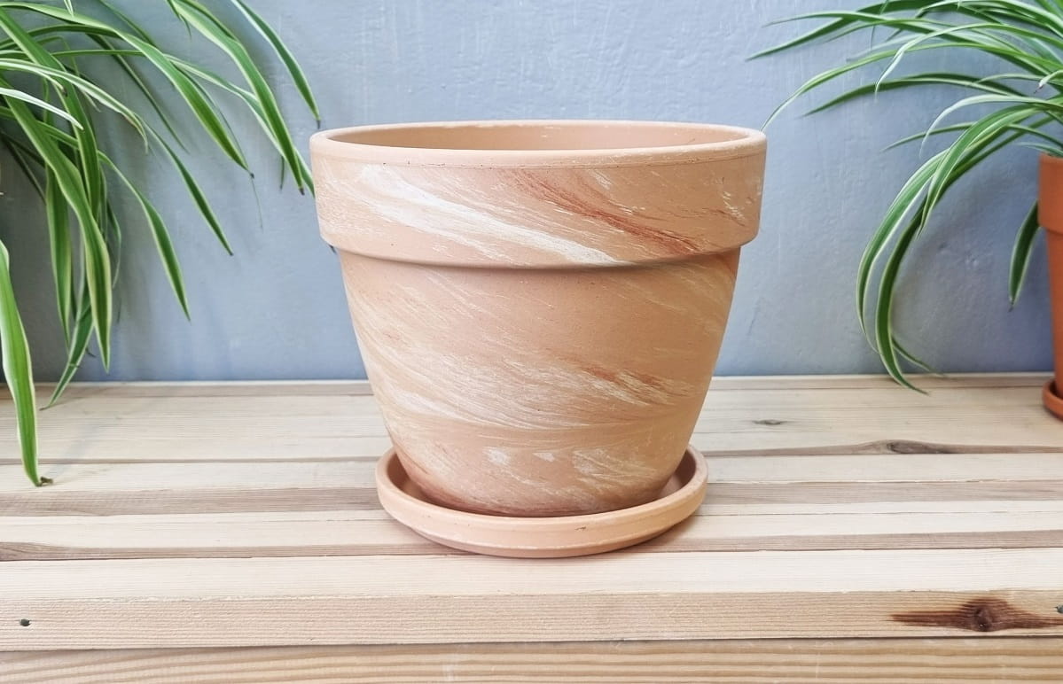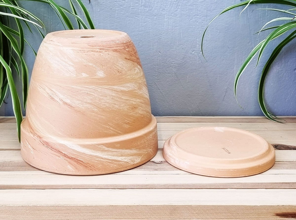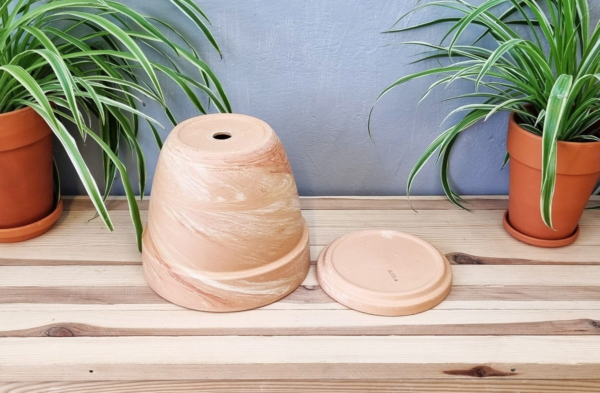 - kolor i powierzchnia nie są jednorodne - zdarzają się naturalne przebarwienia i nierówności, a po podlaniu doniczka robi się wilgotna i nieco ciemniejsza