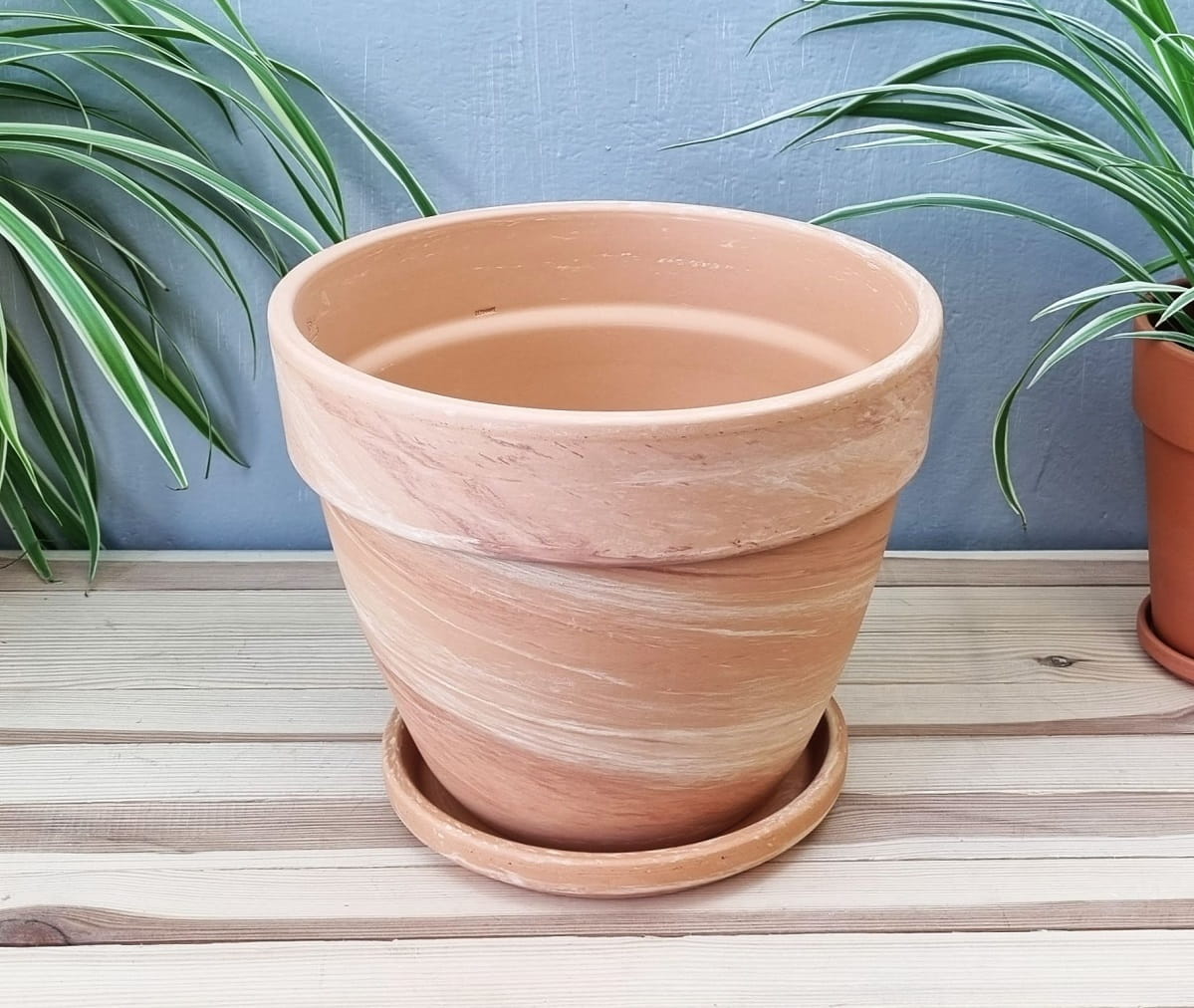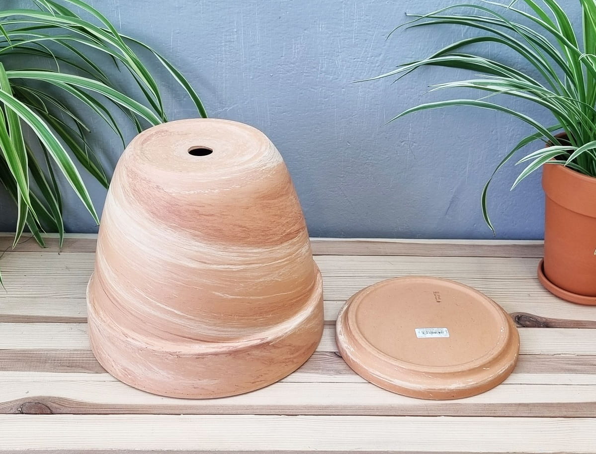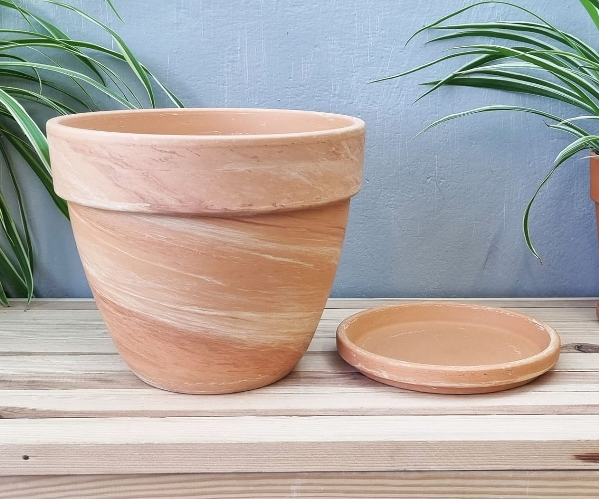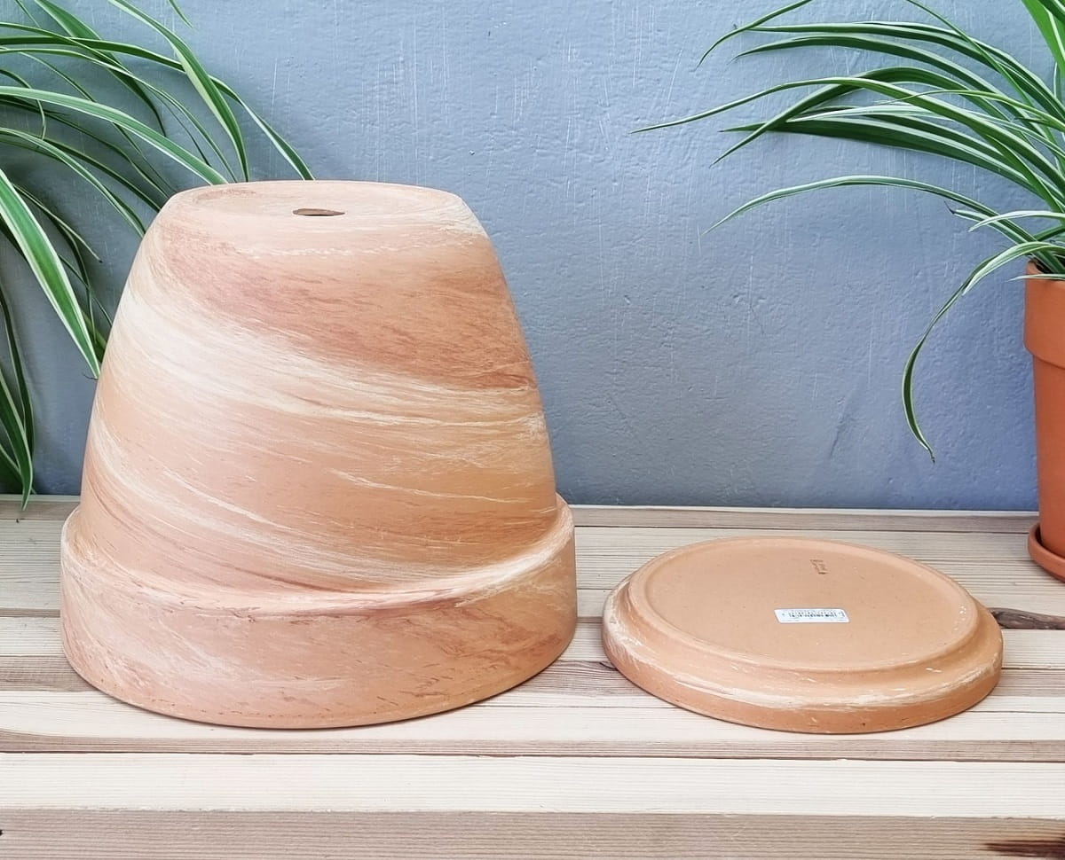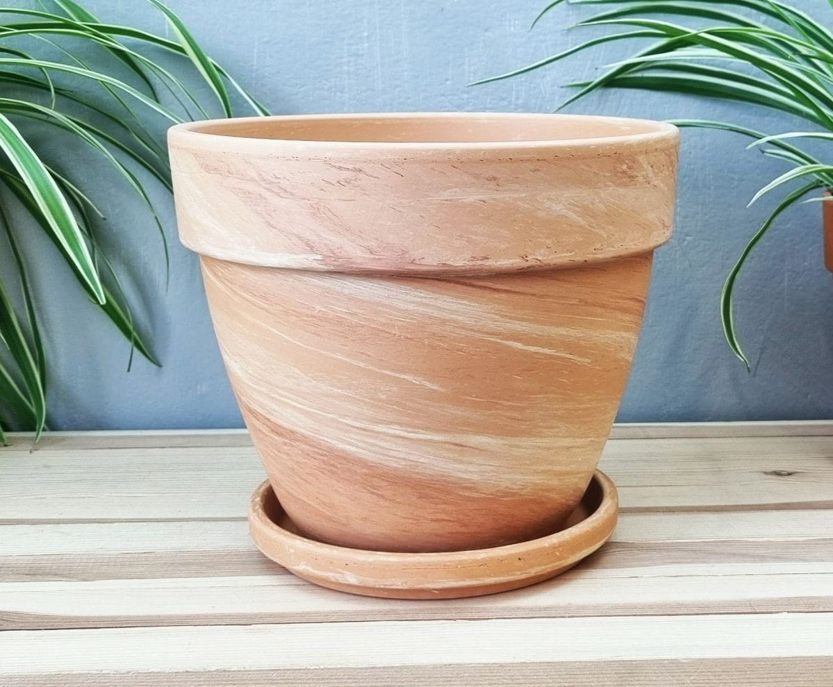 - kolor i powierzchnia nie są jednorodne - zdarzają się naturalne przebarwienia i nierówności, a po podlaniu doniczka robi się wilgotna i nieco ciemniejsza