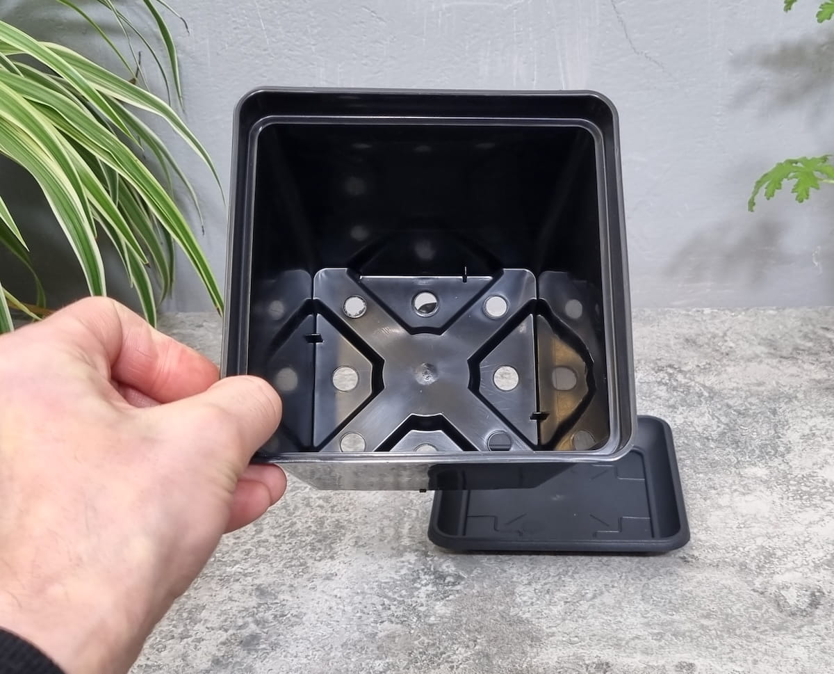 - kwadratowy kształt ułatwia układanie doniczek na zagonach, a także w skrzynkach, kuwetach lub paletach uprawowo-transportowych