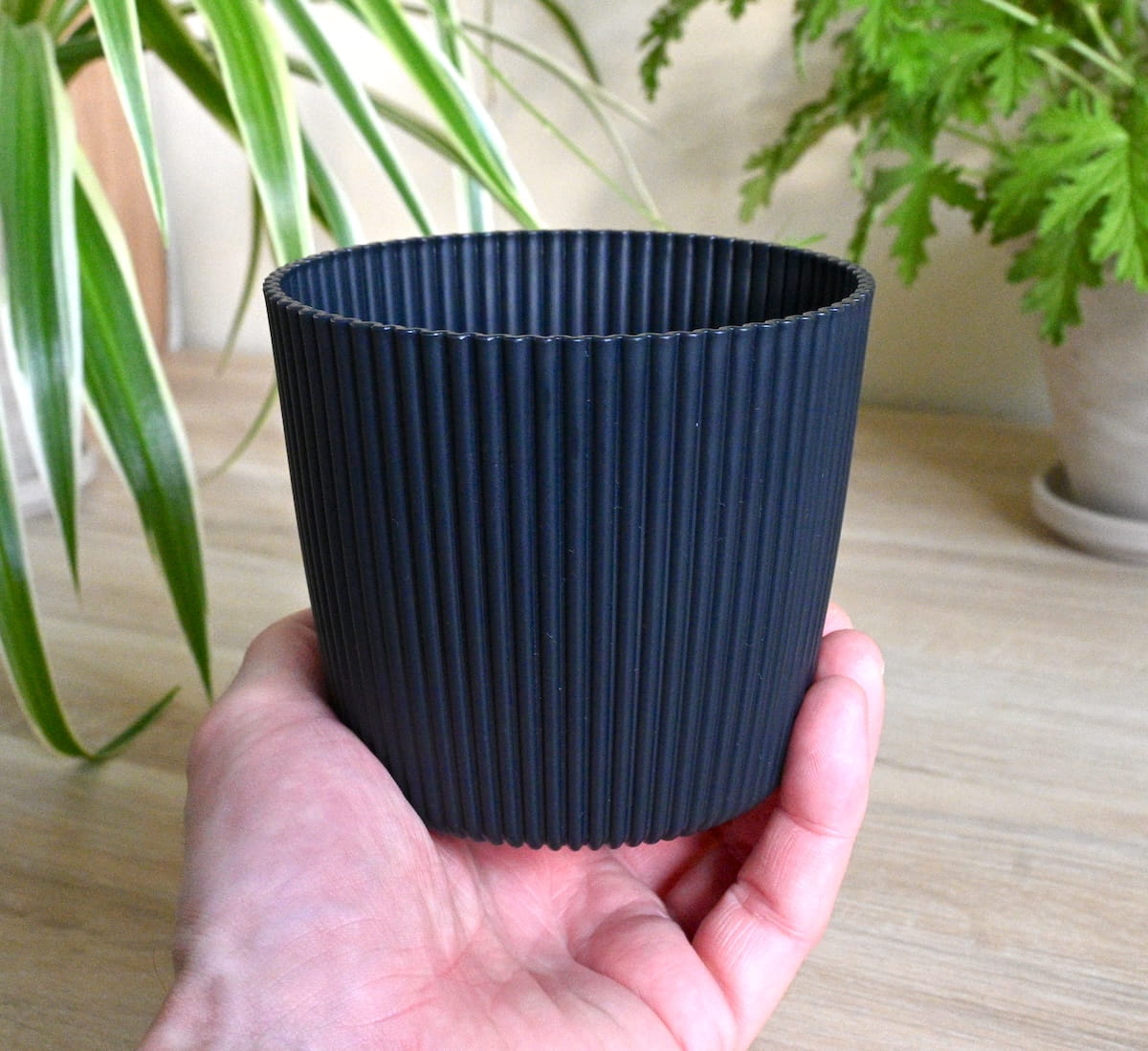- elegancka prosta doniczko-osłonka z efektownym ryflowaniem