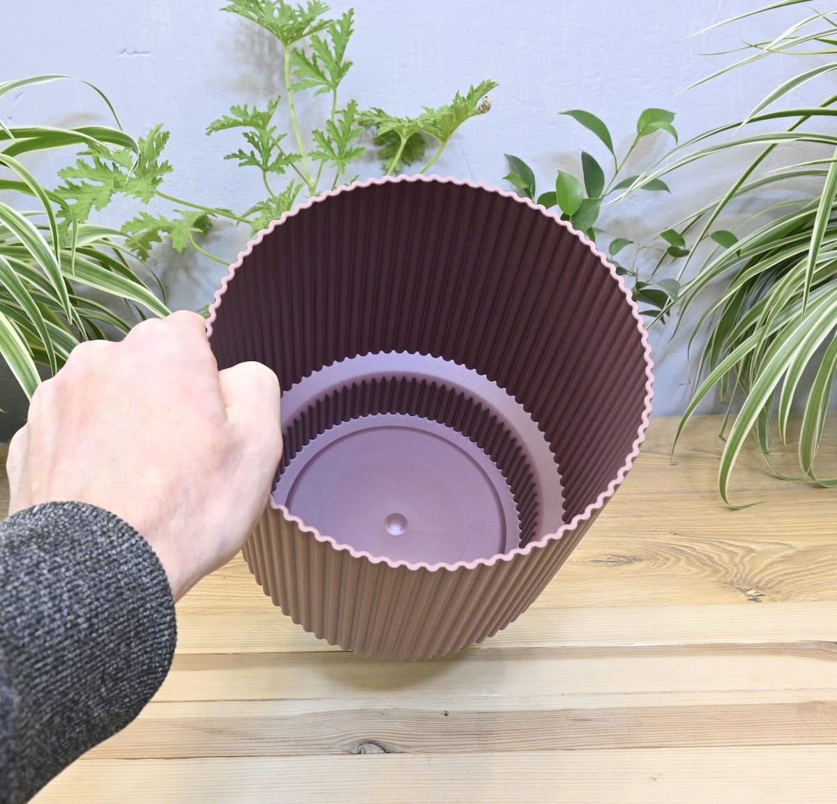 - elegancka doniczka w cylindrycznym kształcie z efektownym ryflowaniem