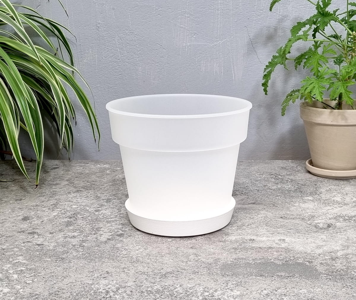 Doniczka Planti 19,5cm 3L przeźroczysta mleczna z białą podstawką