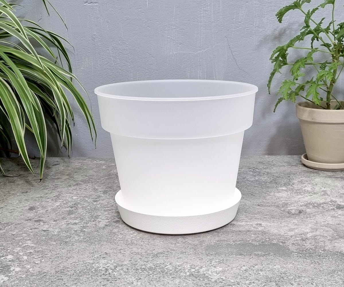 Doniczka Planti 23,5cm 5,4L przeźroczysta mleczna z białą podstawką