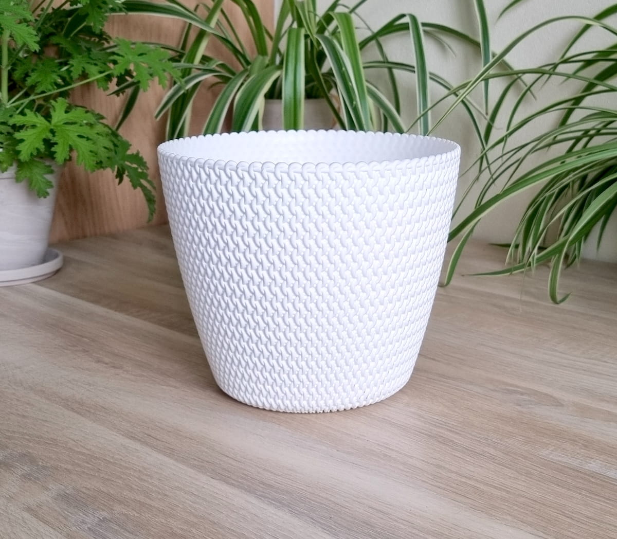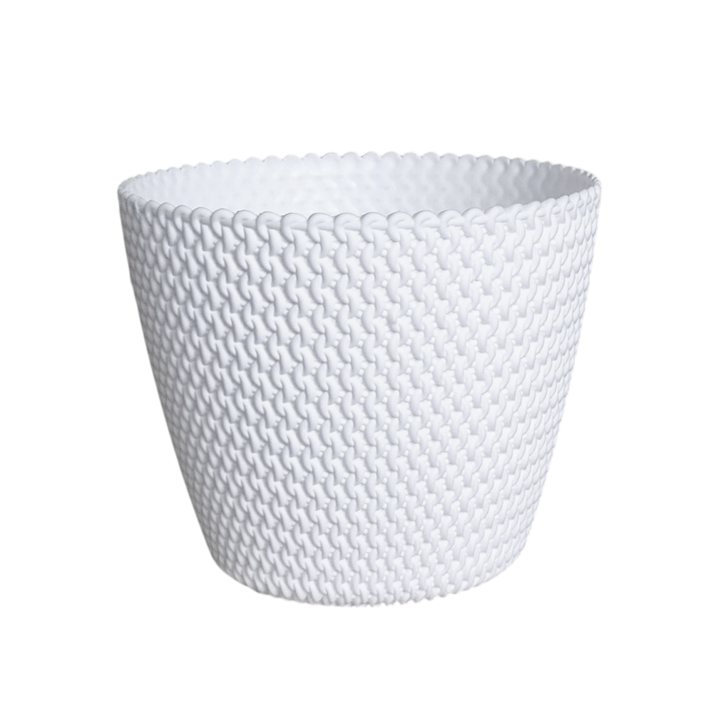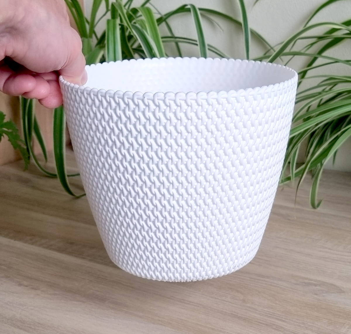 Doniczka Splofy 19cm biała, wzory dziewiarskie - osłonka na kwiaty domowe