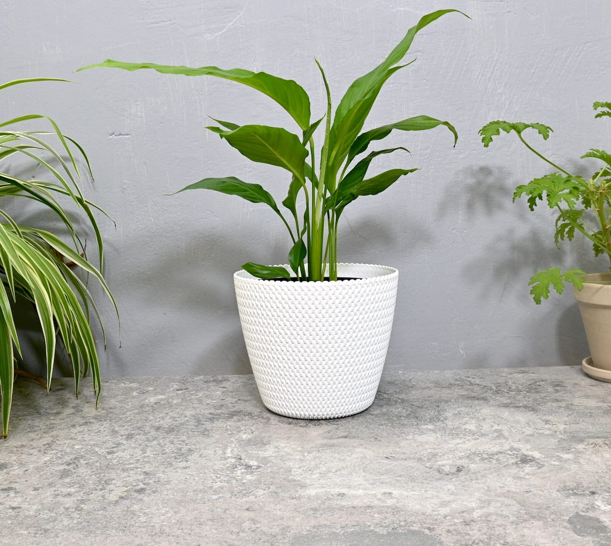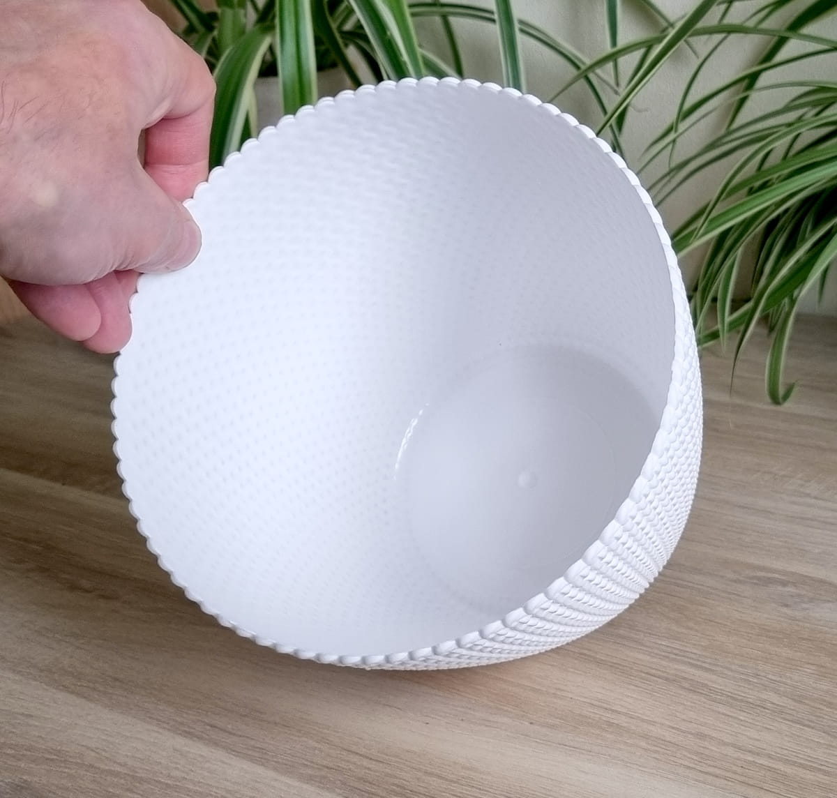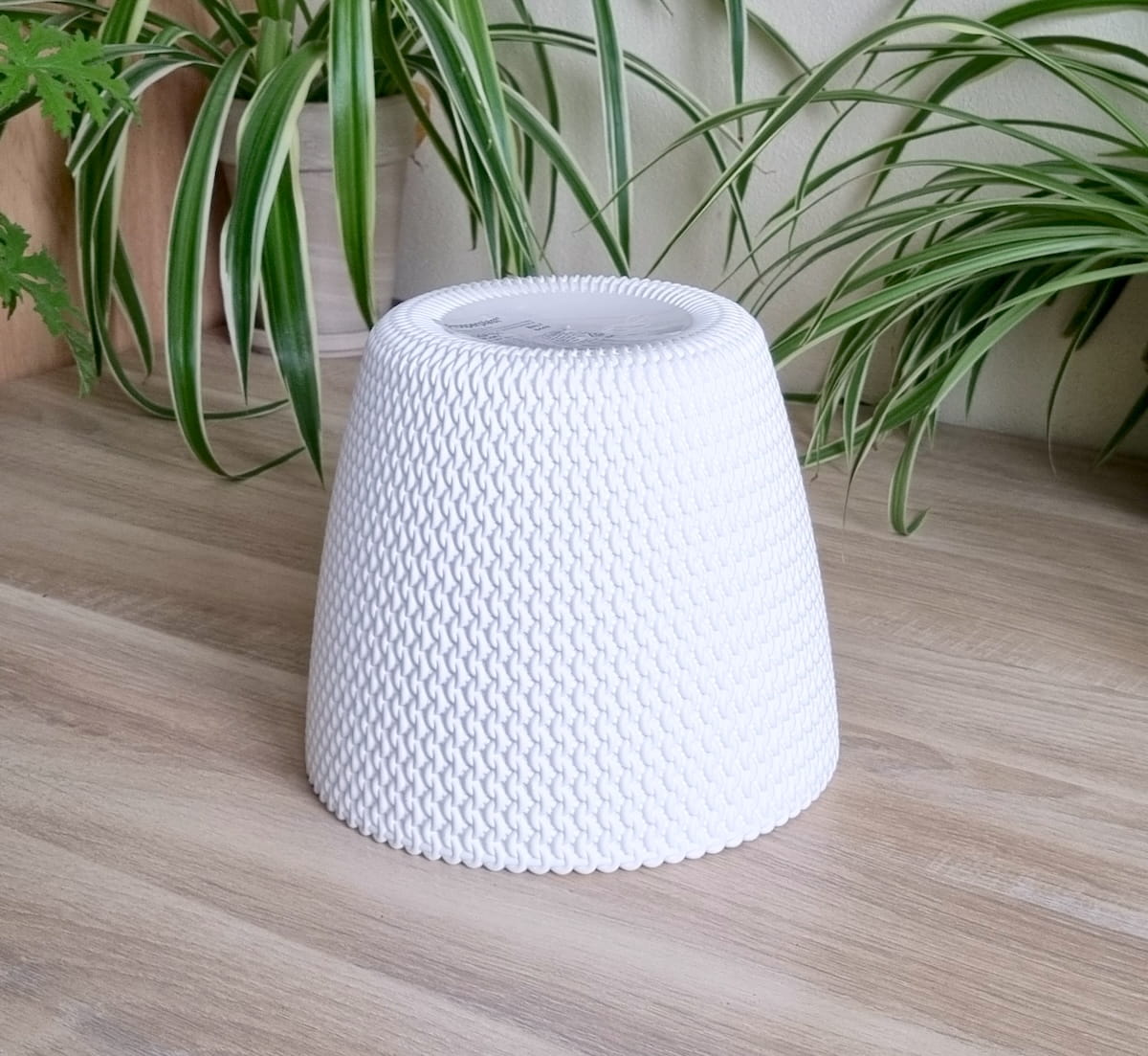 Doniczka Splofy 19cm biała, wzory dziewiarskie - osłonka na kwiaty domowe