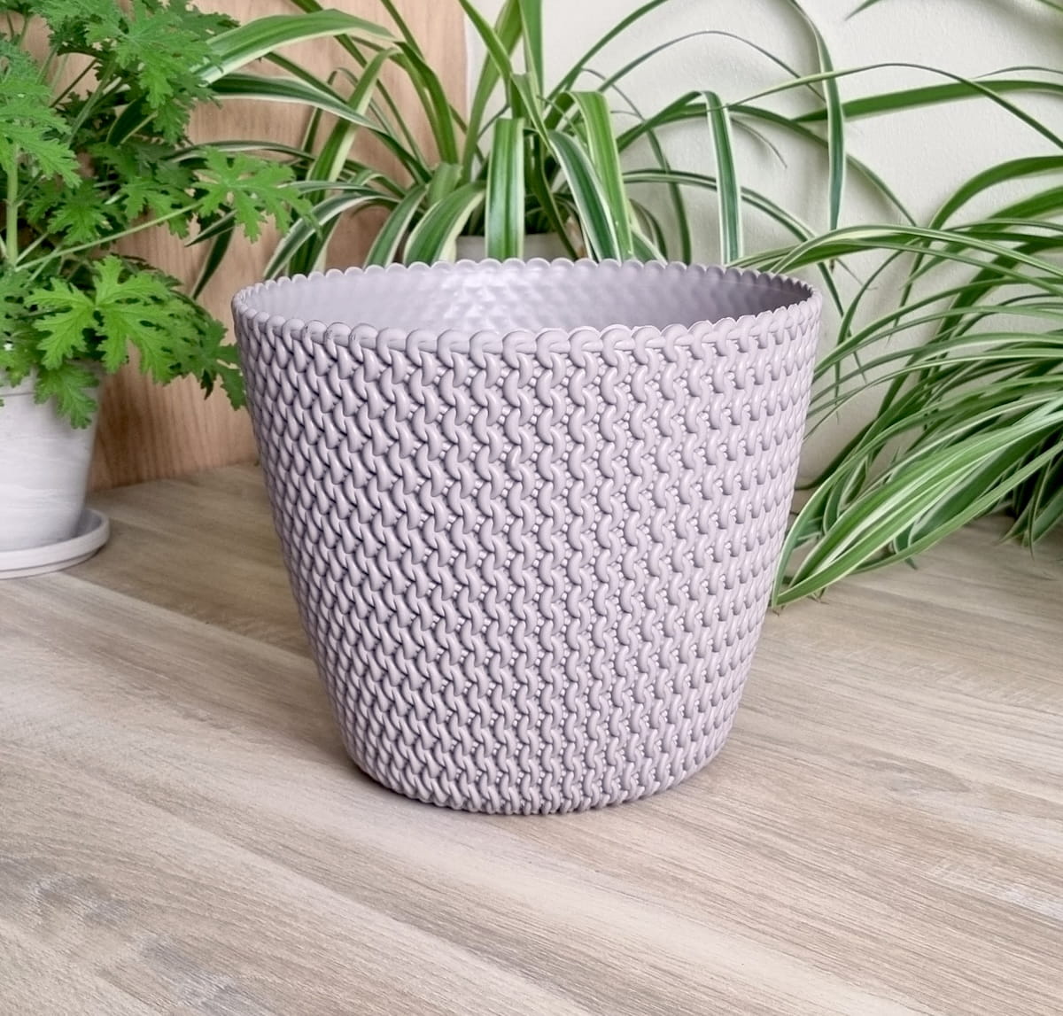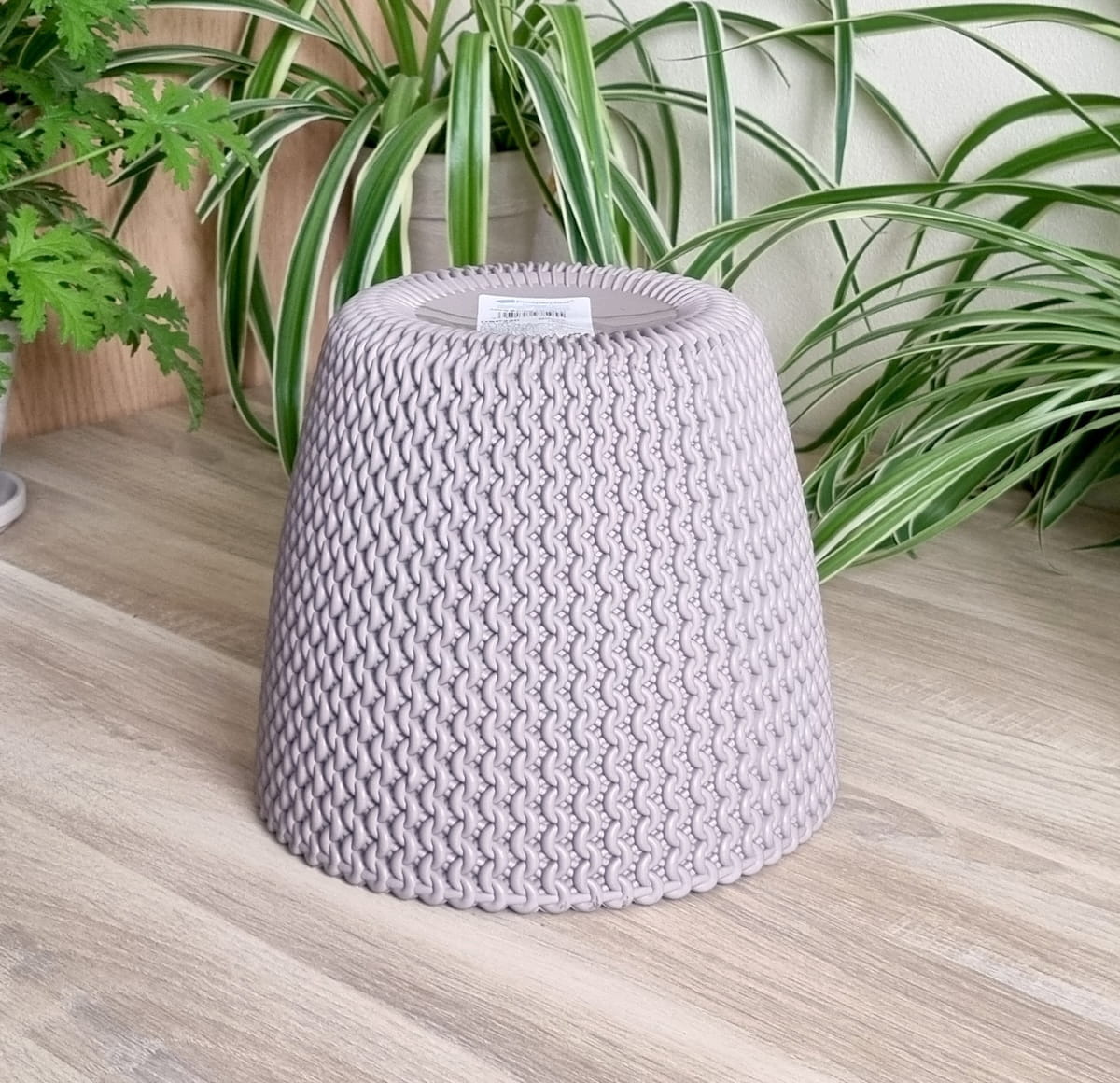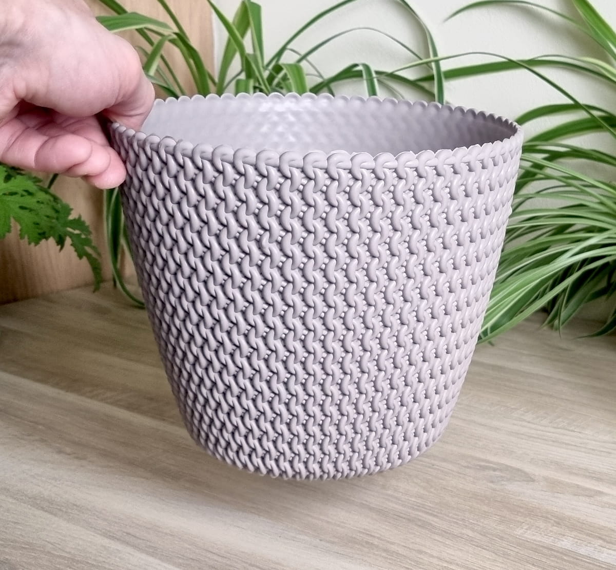 - piękna doniczko-osłonka imitująca sploty wełniane