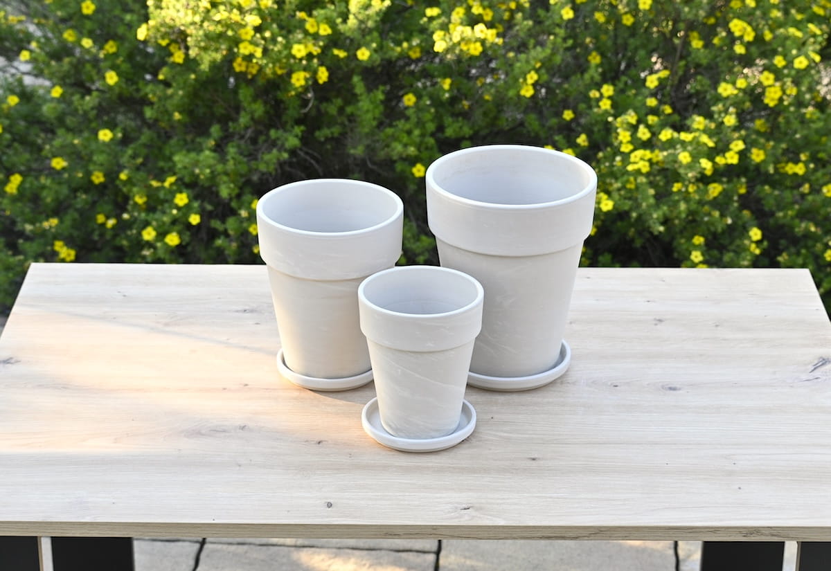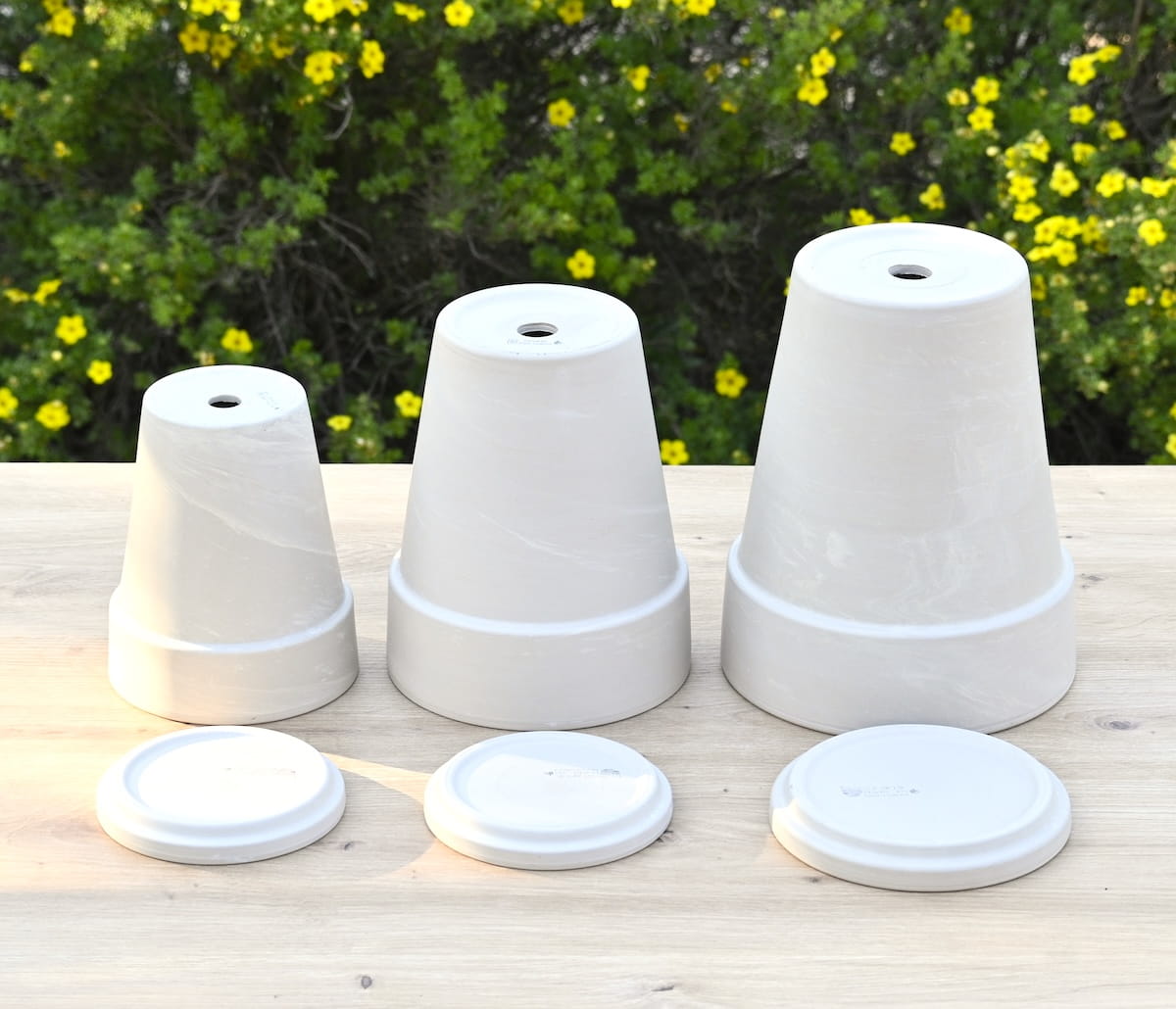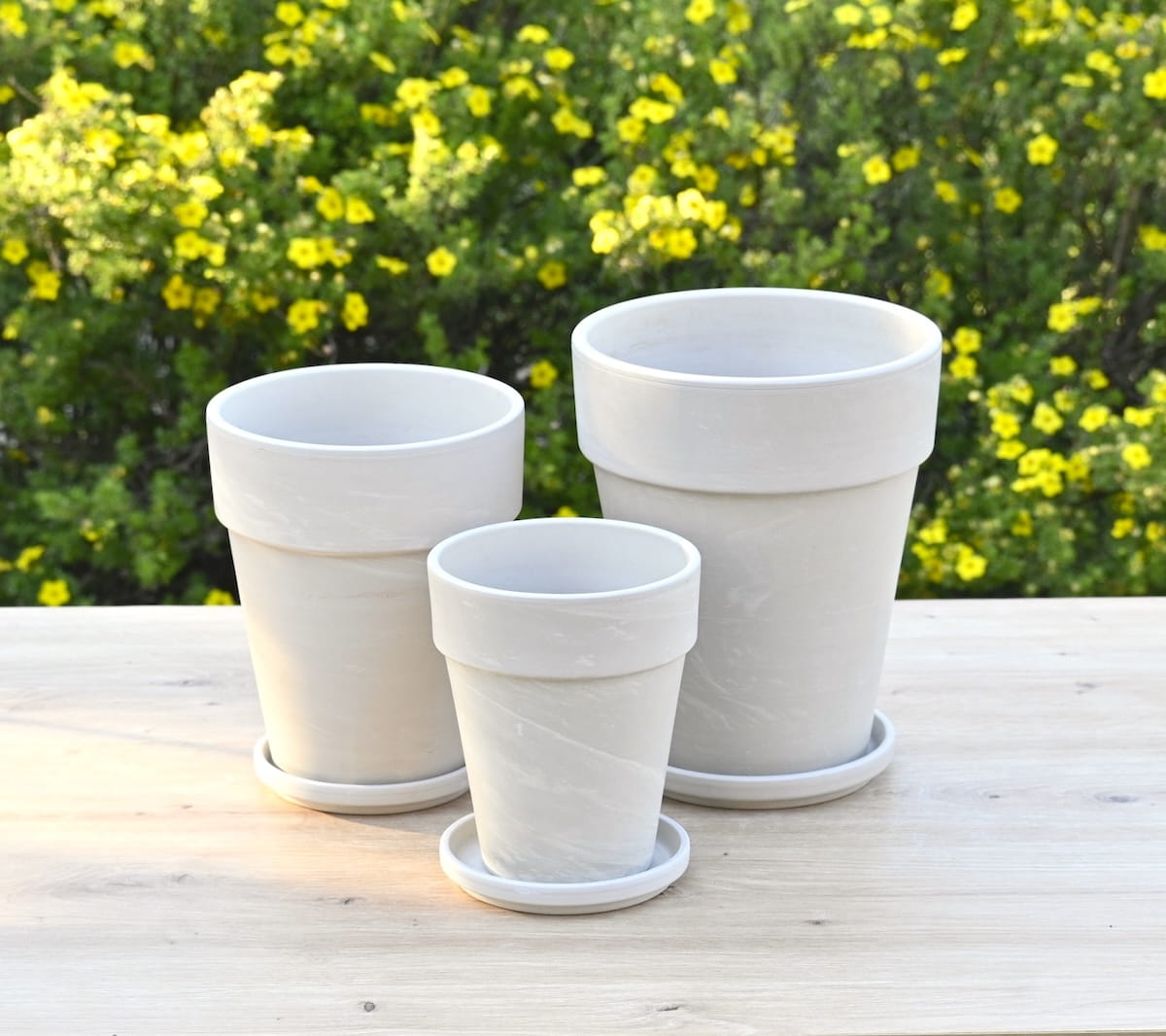 - zestaw składa się z trzech doniczek Terakota Granit XL o średnicach: 12 cm, 15 cm oraz 17 cm oraz odpowiednio dobranych podstawek