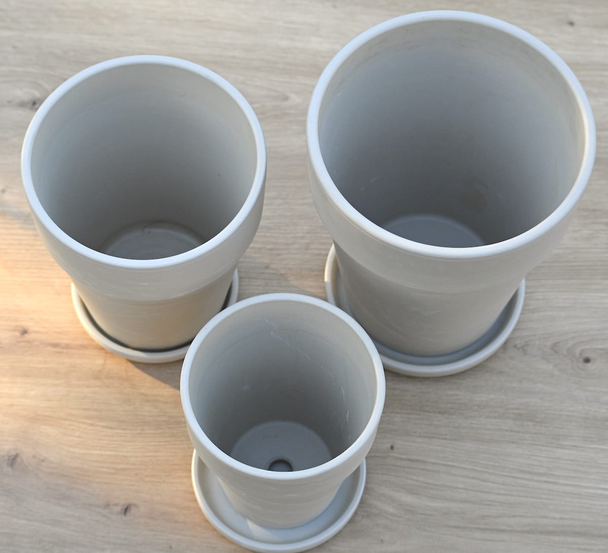 Trzy różnej wielkości doniczki terakotowe z podstawkami w kolorze Granit: