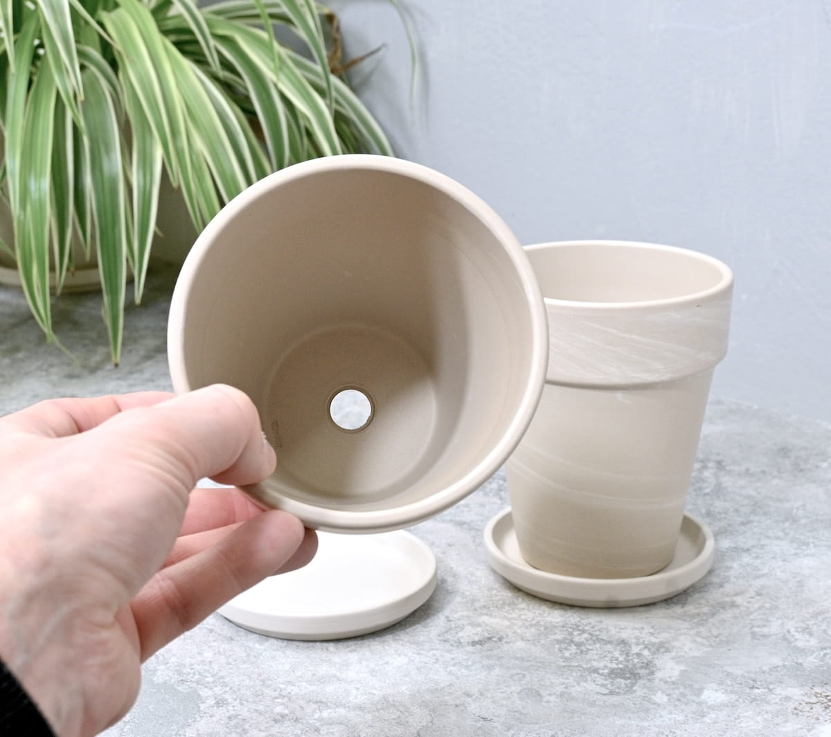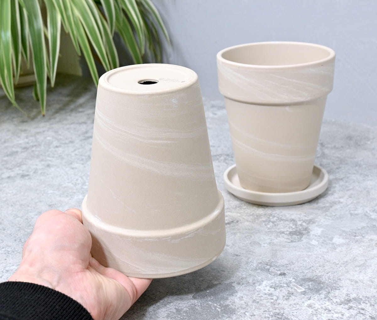 - kolor i powierzchnia nie są jednorodne - zdarzają się naturalne przebarwienia i nierówności, a po podlaniu doniczka robi się wilgotna i nieco ciemniejsza
