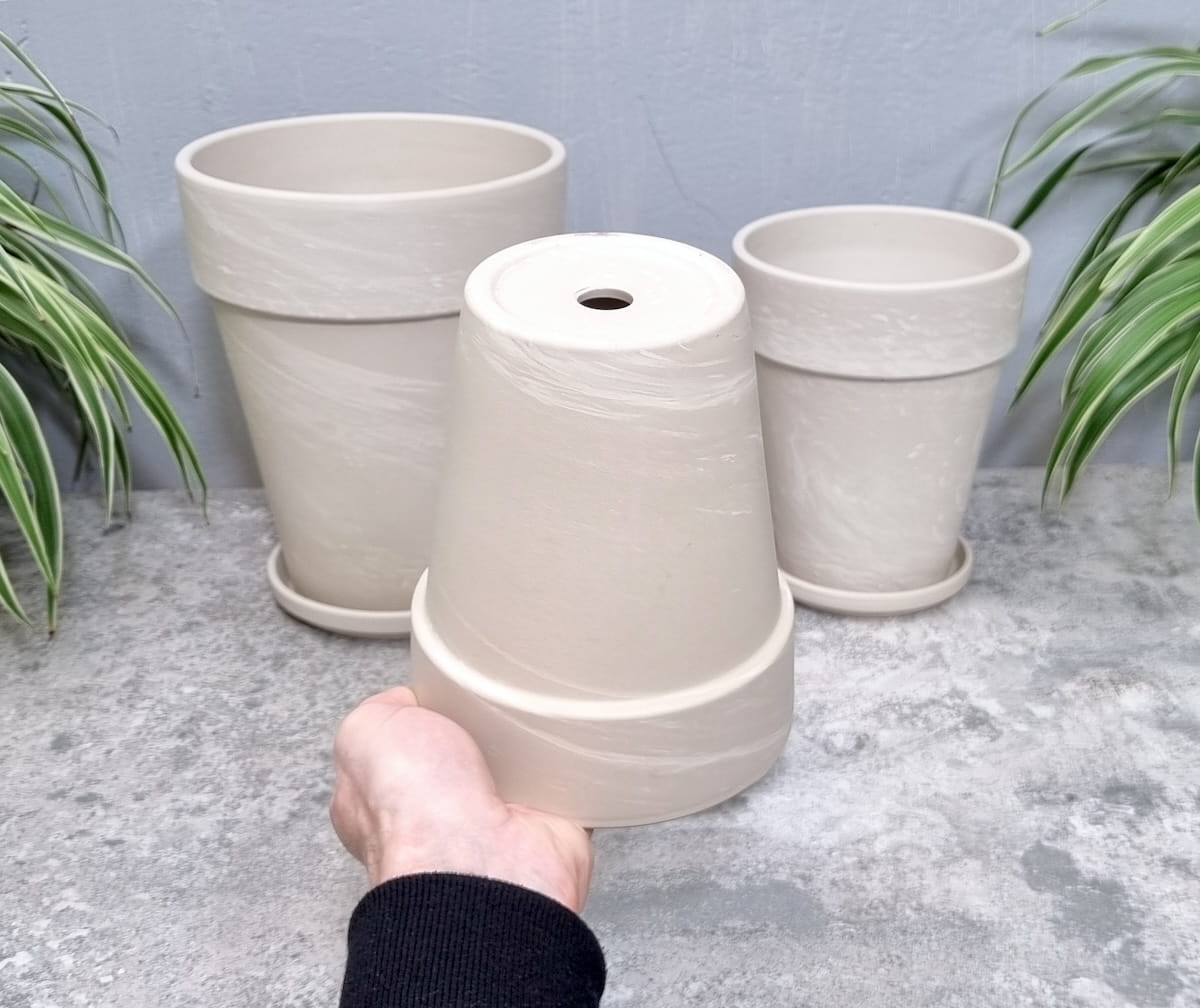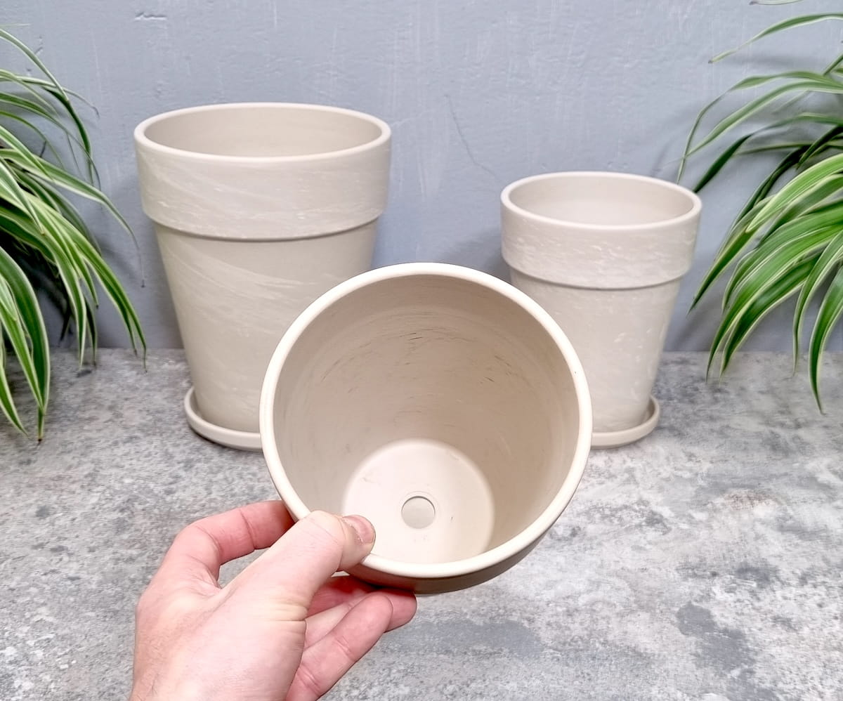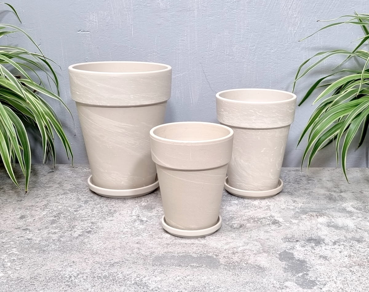 - zestaw składa się z trzech doniczek Terakota Granit XL o średnicach: 15 cm, 17 cm oraz 22 cm oraz odpowiednio dobranych podstawek