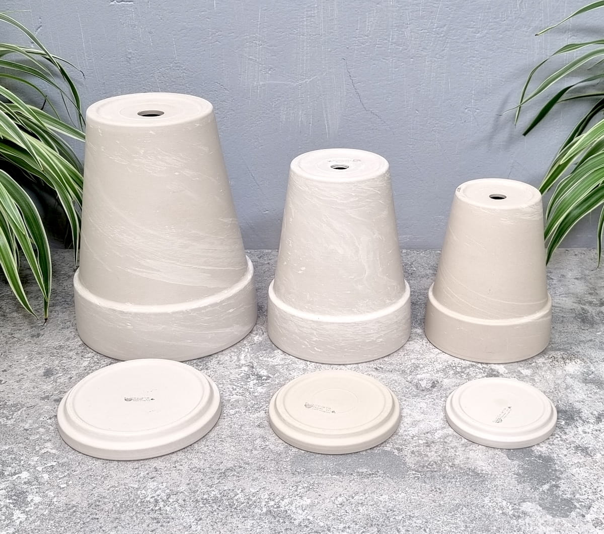 Trzy różnej wielkości doniczki terakotowe z podstawkami w kolorze Granit: