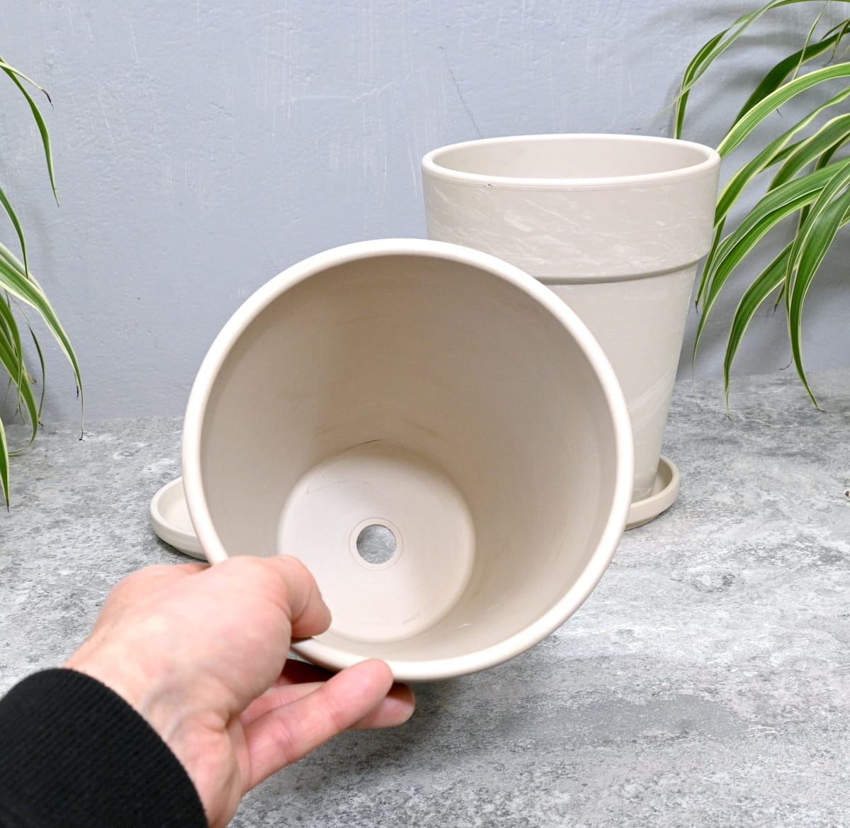 - kolor i powierzchnia nie są jednorodne - zdarzają się naturalne przebarwienia i nierówności, a po podlaniu doniczka robi się wilgotna i nieco ciemniejsza