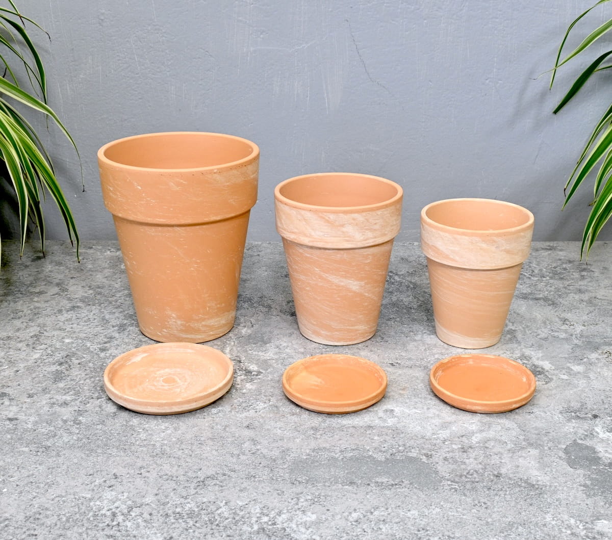 Trzy różnej wielkości doniczki terakotowe z podstawkami w kolorze Piasek: