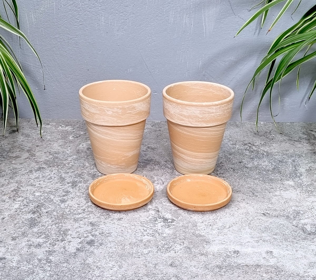 Doniczki gliniane wysokie w kolorze piaskowym z podstawkami - zestaw 2 sztuk: