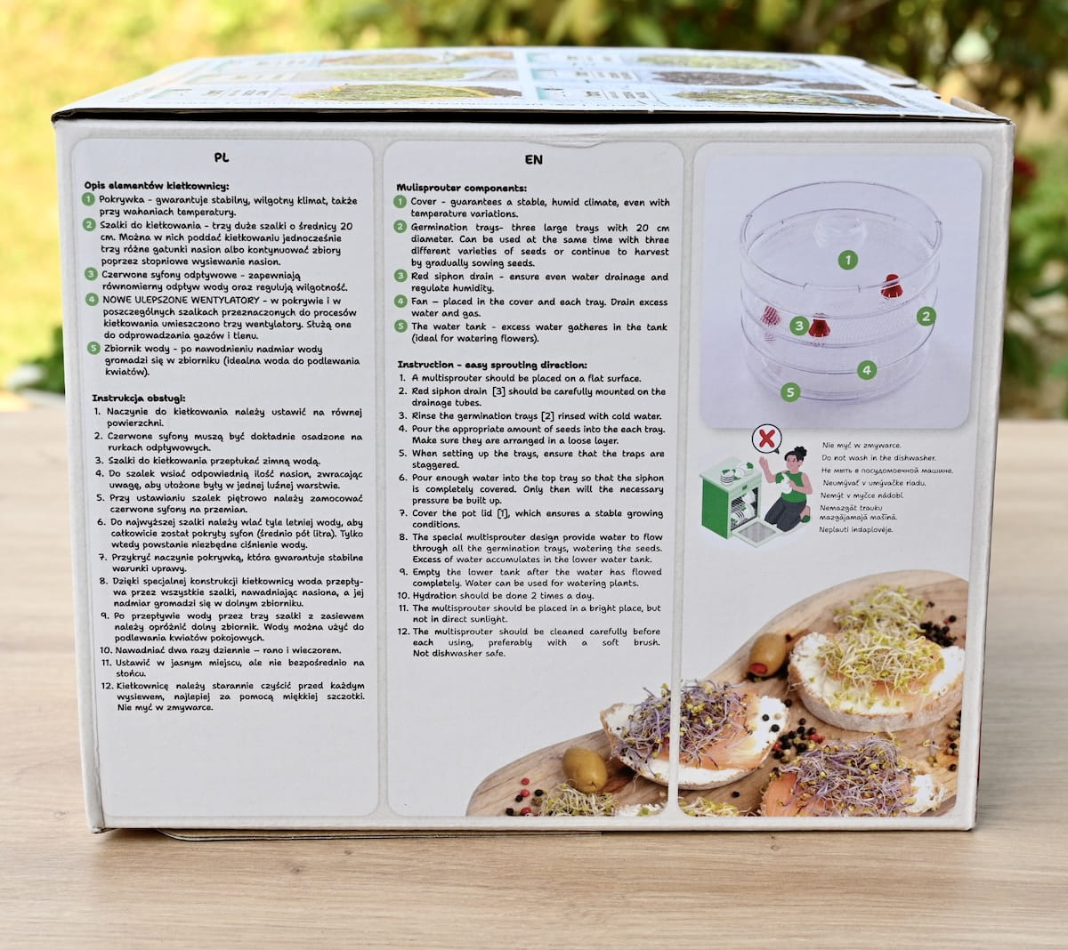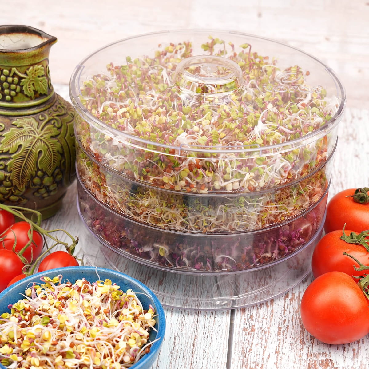 - wygodna kiełkownica umożliwiająca uprawę trzech rodzajów kiełków jednocześnie