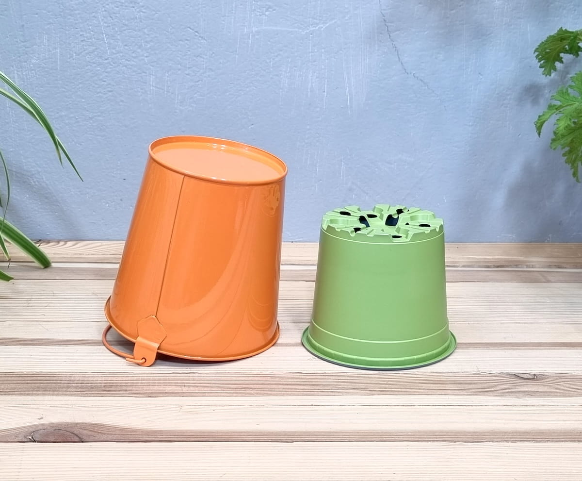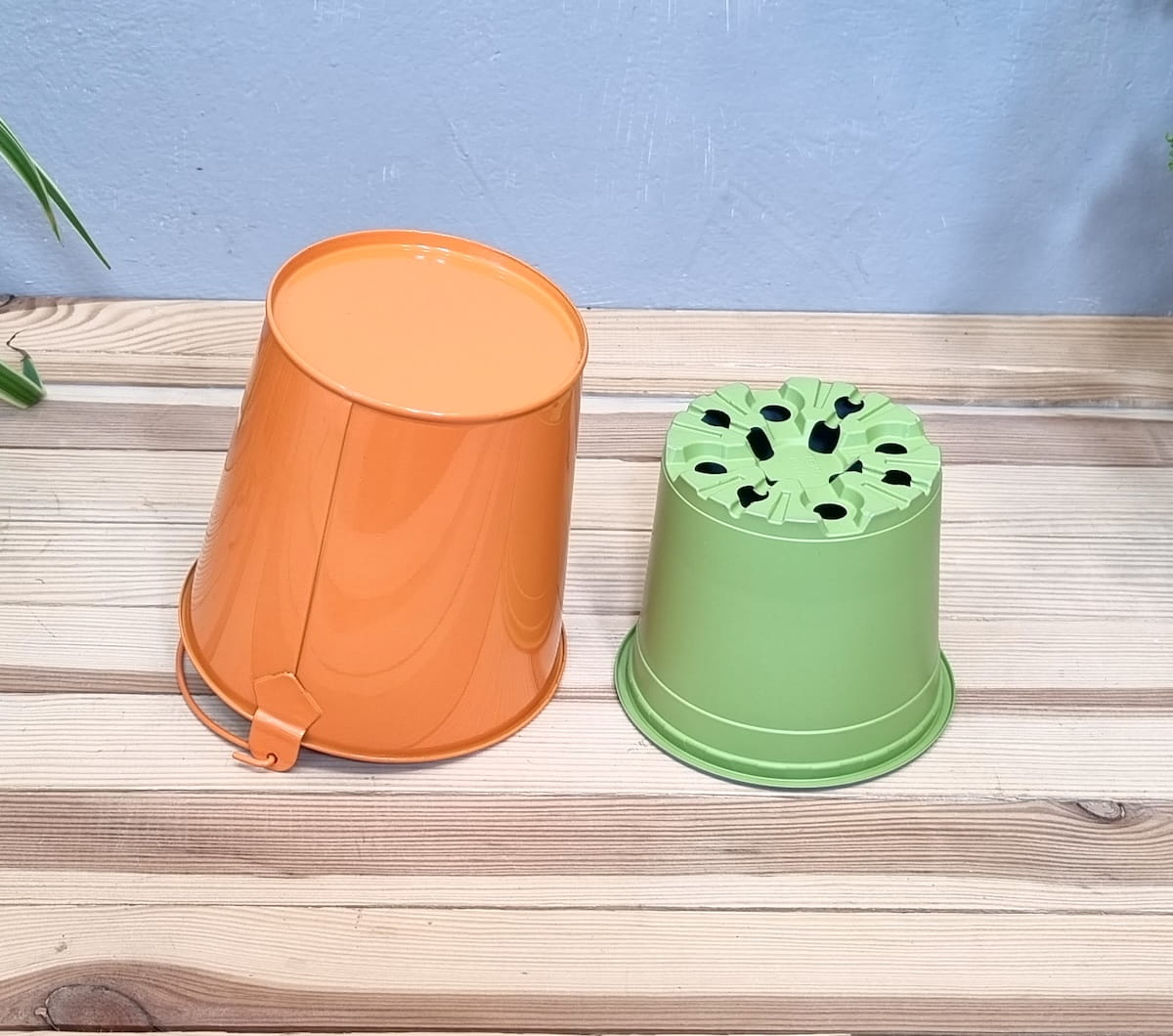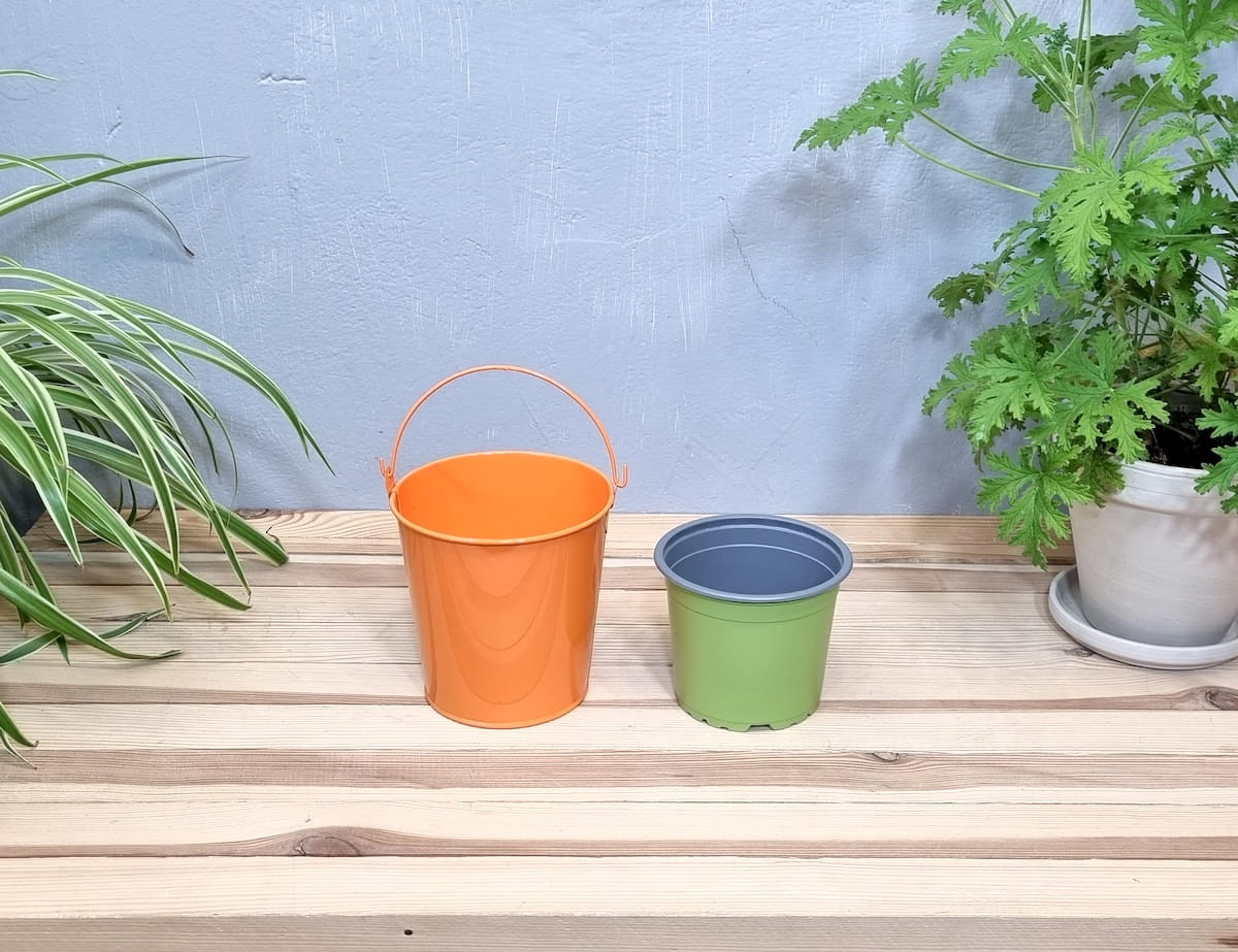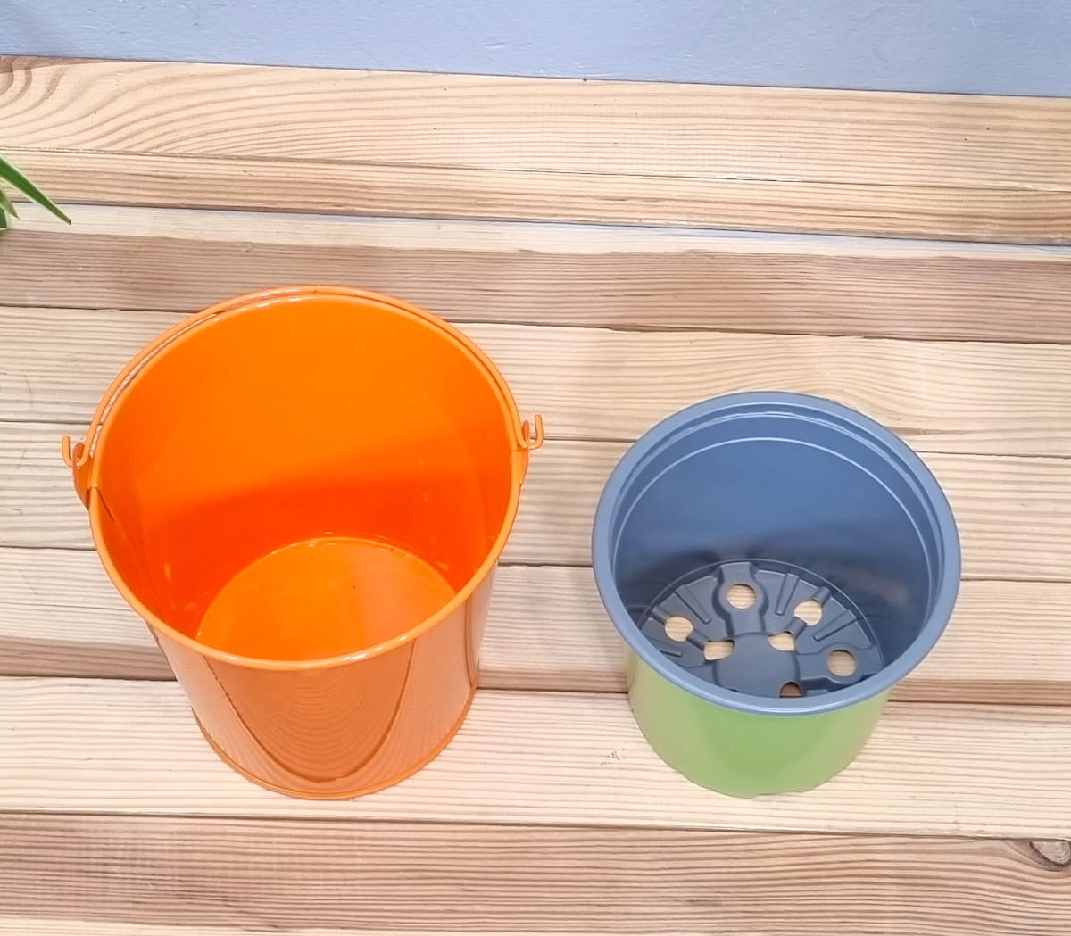 Doniczka metalowa WIADERKO 13cm POMARAŃCZOWE - osłonka z wkładem uprawowym